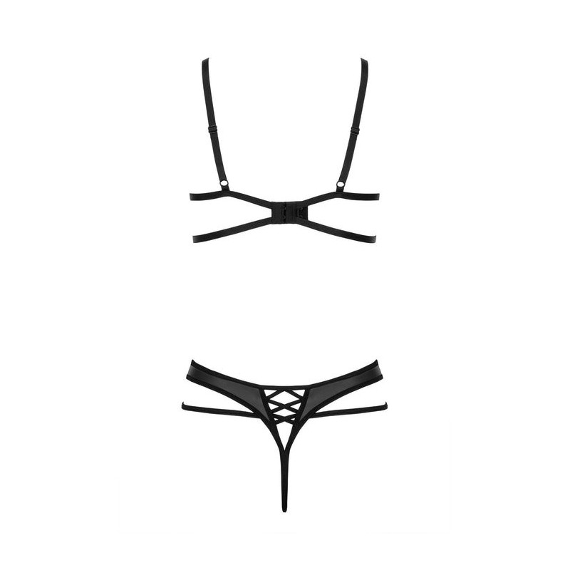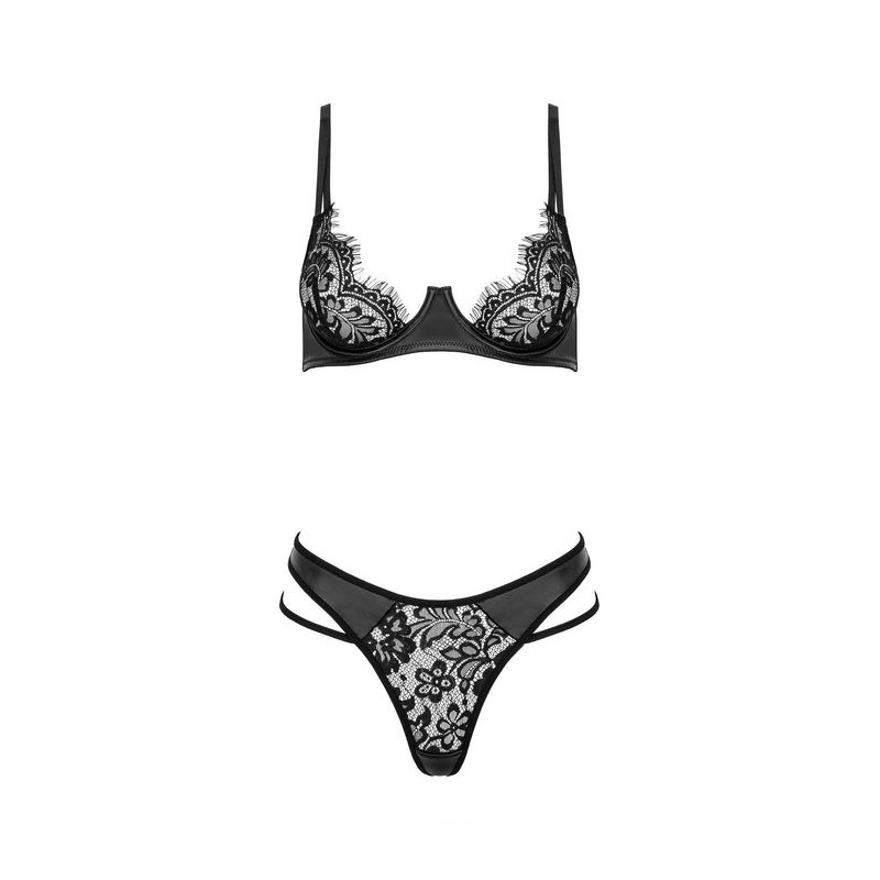 Scoprite la sensualità e l'eleganza con questo seducente set che esalta la vostra femminilità e aumenta la vostra sicurezza. Questo raffinato completo, realizzato in delicato pizzo nero e tessuto simile al lattice, mette in risalto la vostra bellezza naturale e vi regala una sensazione incredibilmente femminile e sexy. Il set comprende reggiseno e perizoma, che formano una composizione unica e armoniosa. Le spalline e le chiusure regolabili assicurano una vestibilità e un comfort ideali sia di giorno che di sera. Il reggiseno con ferretto accentua la bellezza naturale del vostro seno, mentre il perizoma mette in risalto le vostre curve con il suo design sensuale. Il reggiseno e il perizoma, con i loro intricati ornamenti, sottolineano con eleganza le caratteristiche del corpo.