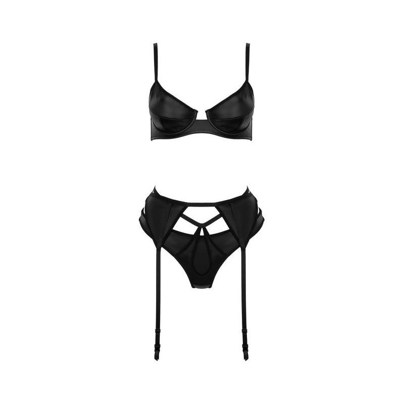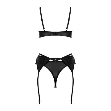 Questo splendido set di lingerie a 3 pezzi mette in risalto sensualità e femminilità, realizzato in un tessuto simile al lattice. Il reggiseno con ferretto offre un sostegno eccellente, accentuando la bellezza naturale del seno. Le coppe morbide si adattano perfettamente al corpo, garantendo una vestibilità confortevole. La parte posteriore del reggiseno presenta una chiusura regolabile a 3 ganci e le spalline sono regolabili individualmente. Il set comprende un sensuale reggicalze che sottolinea il punto vita e aggiunge eleganza al look complessivo. Anche le spalline della giarrettiera sono regolabili. Completa il set un elegante perizoma che rivela splendidamente i glutei. Questo set è ideale per le donne che desiderano rafforzare la loro sicurezza e il loro stile unico.