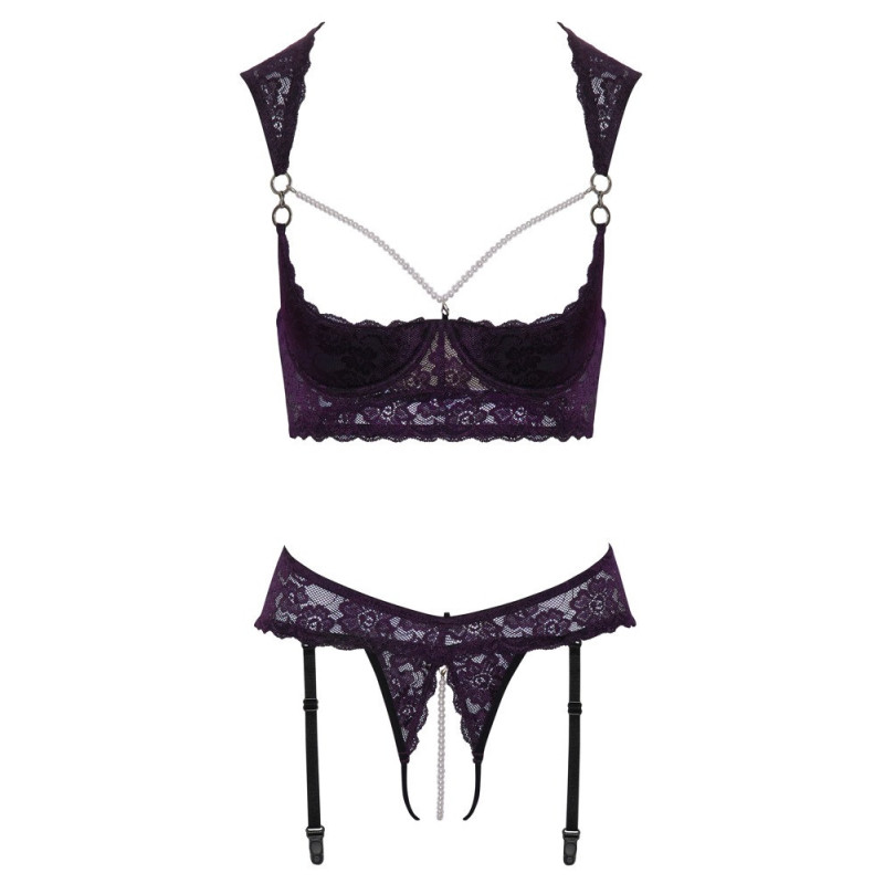 Sollevatore lungo e reggicalze riostring ouvert combinati nel set di Cottelli LINGERIE. Realizzato in pizzo viola scuro con dettagli neri, decorato con anelli argentati e perline bianche. Il ferretto con coppe leggermente imbottite mette il seno in perfetta forma e direttamente in vista. La collana di perle che incornicia il seno è removibile grazie ai suoi piccoli moschettoni. Raffinata soluzione di spalline con laccio sulle spalle, piccola chiusura al collo. Le spalline e la chiusura con gancio sono regolabili nella parte posteriore. Il Garter Rio seduce con una stimolante collana di perle sul cavallo aperto, che è rimovibile, proprio come le 6 bretelle regolabili.