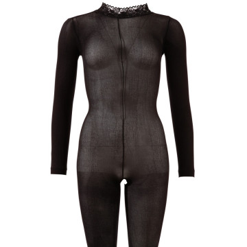 Trasparenza nera con apertura all‘inguine. Colletto di pizzo con bottoni a pressione. Con piede. 100% poliammide.