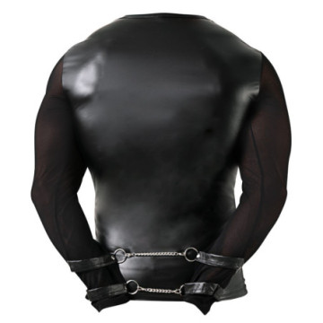 Camicia a maniche lunghe in powernet elastico e morbido con imbracatura cucita e anellata sul davanti. Torna completamente nel look opaco di tendenza. Lunghe maniche in powernet all'estremità con cinghie bondage cucite dall'aspetto opaco, che sono dotate di anelli, nei quali può essere agganciata una breve catena di collegamento con i moschettoni.