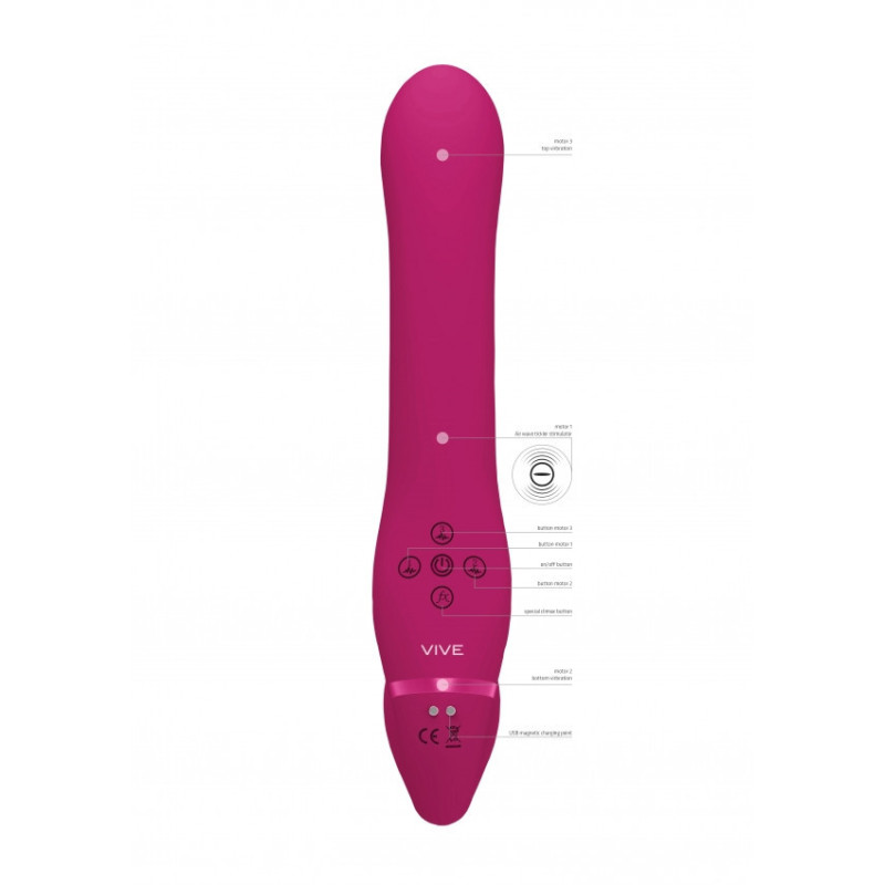 Lo strap-on strapless VIVE047 per punto-G con tecnologia a onde d'aria sicuramente offre il meglio su entrambe le estremità. Tre motori di Nuova Generazione F1 a 10 velocità/funzioni di nuova generazione controllati in modo indipendente alimentano questo vibratore dal design accattivante. Il giocattolo contiene un motore con punta di vibrazione del punto G, un motore di vibrazione interno e un motore pulsante a onde d'aria stimolante il clitoride con un tickler. Con oltre 1.000 diverse combinazioni, questo giocattolo ti porterà in luoghi mai immaginati. Quando ti avvicinerai all'orgasmo, un solo tocco del pulsante della funzione speciale orgasmo porterà immediatamente tutti i motori alla massima potenza/velocità. Il vibratore in silicone di grado medicale completamente ricaricabile tramite USB magnetico, vanta una durata della batteria di 45 minuti ed è totalmente impermeabile(IPX7) e ciò significa che puoi goderti questo giocattolo ovunque tu voglia. Tutti i vibratori VIVE hanno 1 anno di garanzia.