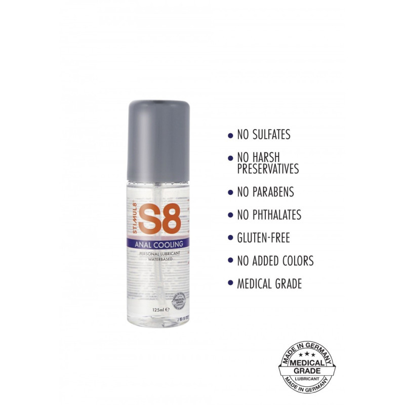 Il lubrificante premium S8 Waterbase Anal Cooling offre una scivolata indulgente e duratura; perfetto per avventure backdoor giocherellona! Questa formula stupefacente e duratura di S8 è completamente priva di parabeni, senza ftalati, senza glutine, senza solfati, inoltre non contiene colori aggiunti o conservanti aggressivi per un irresistibile appeal "naturale". Quando applicato, il lubrificante anale S8 Waterbase Cooling ha un delicato effetto rinfrescante sulla pelle, aggiungendo una piacevole sensazione di formicolio proprio dove lo vuoi!
