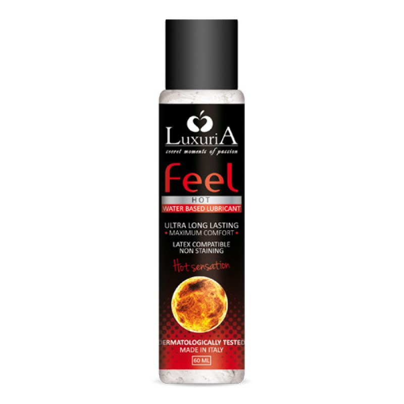 Luxuria Feel Hot Sensation è un lubrificante intimo a base acquosa specifico per l'idratazione e la lubrificazione vaginale o anale prima del rapporto intimo. Non unge, non contiene grassi. Grazie alla sua esclusiva formulazione ricca di preziosi elementi attivi naturali Luxuria Feel Hot Sensation previene fastidi, bruciori ed irritazioni tipiche delle zone intime sottoposte a stress naturali e prolungati. Prodotto idrosolubile. Può essere usato in modo sicuro con oggetti e dispositivi in lattice, la sua formula a base acquosa ne garantisce una totale compatibilità con i preservativi. Applicare la quantità desiderata di Luxuria Feel Hot Sensation sulla parte del corpo desiderata o su un sex toy e massaggiare. La sua formula esclusiva dona una stimolante sensazione di calore. Latex Compatibile Dermatologicamente testato
