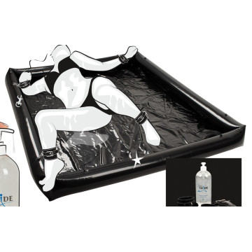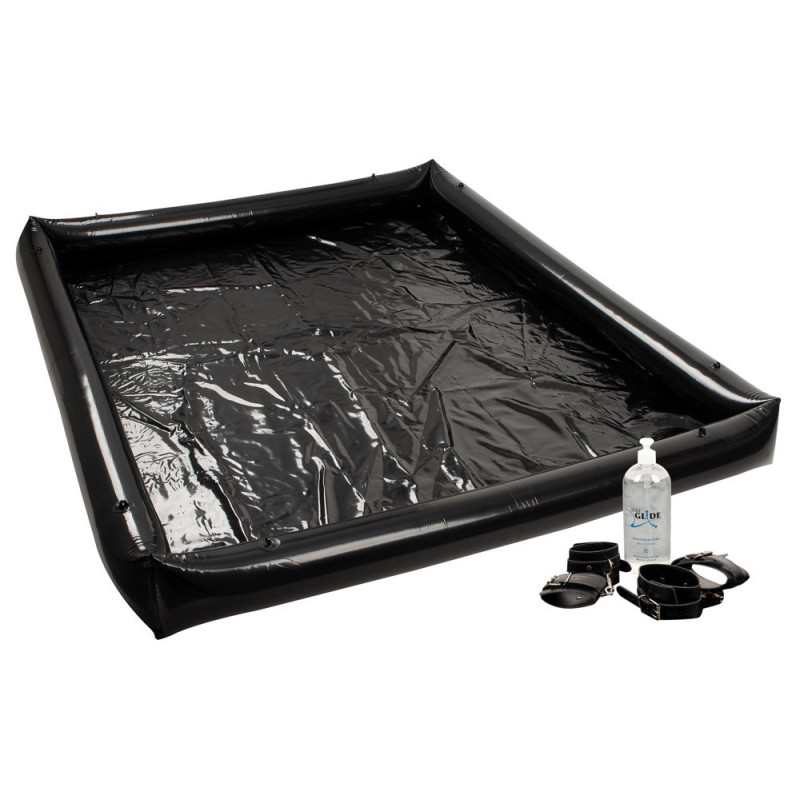 Include le cinghie per mani e piedi e 1 litro di lubrificante! Foglio di vinile nero lucido Games da collezione fetish completo di 4 cinghie e 1 litro di lubrificante. Il telo con il bordo gonfiabile (alto 15 cm) offre una protezione ottimale su tutte le superfici (ad esempio letto, divano, tappeto ecc.) e offre molto spazio (140 x 185 cm) per giochi extra bagnati, oleosi, schiumosi, meravigliosamente scivolosi e quindi accattivanti. Le manette per le mani e per i piedi con i loro moschettoni si agganciano rapidamente e comodamente in 8 occhielli saldati (2 per angolo). Pulito in pochissimo tempo, il foglio è rapidamente pulito e pronto all'uso. Foglio: 100% policloruro (vinile); polsini 85% poliuretano, 15% metallo.