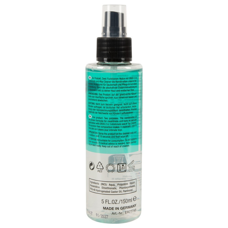 Spray detergente per le zone intime e i giocattoli senza profumo di EROS per la pulizia e la cura in una sola applicazione. La composizione senza alcool è particolarmente delicata per la pelle e per i materiali dei giocattoli. È sufficiente spruzzare sulla parte del corpo o sulla superficie desiderata, lasciare agire per un breve periodo e poi pulire.