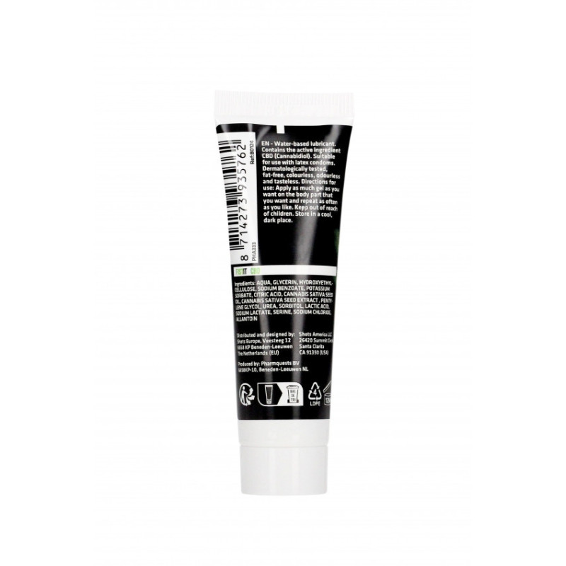 Lubrificante a base d'acqua. Contiene il principio attivo CBD (cannabidiolo). Adatto all'uso con profilattici di lattice. Dermatologicamente testato, non unge, è incolore, inodore, insapore. Istruzioni per l'uso: applicare sul corpo la quantità di gel desiderata e ripetere l'applicazione a piacere. Solo per uso esterno. Tenere fuori dalla portata dei bambini. Conservare in luogo fresco e al riparo dalla luce