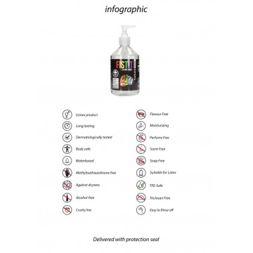 Fist It è un lubrificante a base d'acqua. Adatto all'uso con profilattici di lattice. Dermatologicamente testato, non unge, è incolore, inodore, insapore. Istruzioni per l'uso: applicare sul corpo la quantità di gel desiderata e ripetere l'applicazione a piacere. Solo per uso esterno. Tenere fuori dalla portata dei bambini. Conservare in luogo fresco e al riparo dalla luce.
