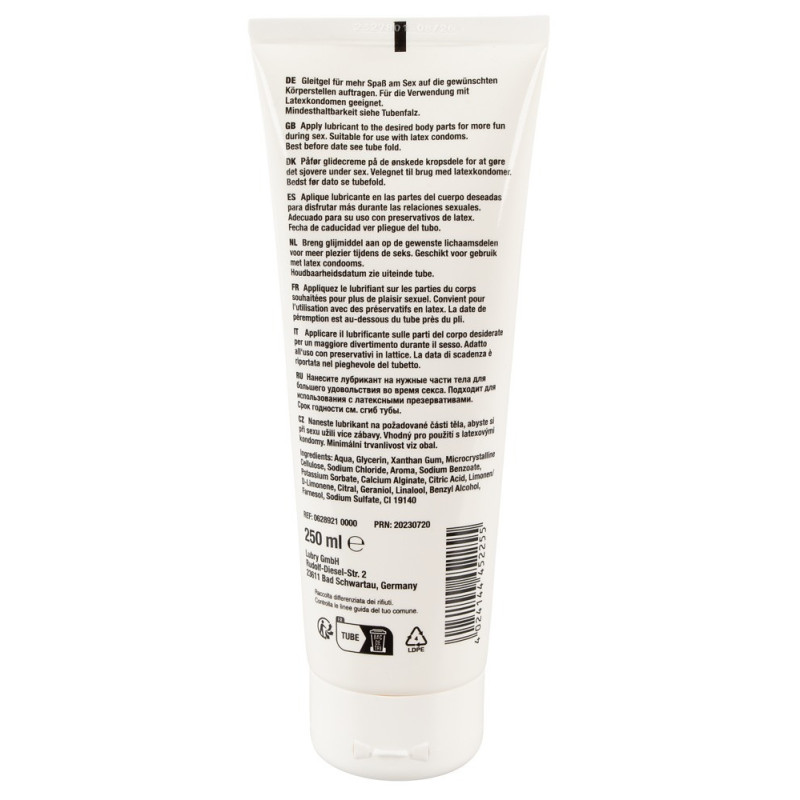 Aqua, Glycerin, Xanthan Gum, Microcrystalline Cellulose, Sodium Chloride, Aroma, Sodium Benzoate, Potassium Sorbate, Calcium Alginate, Citric Acid, Limonen/D-Limonene, Citral, Geraniol, Linalool, Benzyl Alcohol, Farnesol, Sodium Sulfate, CI 19140
