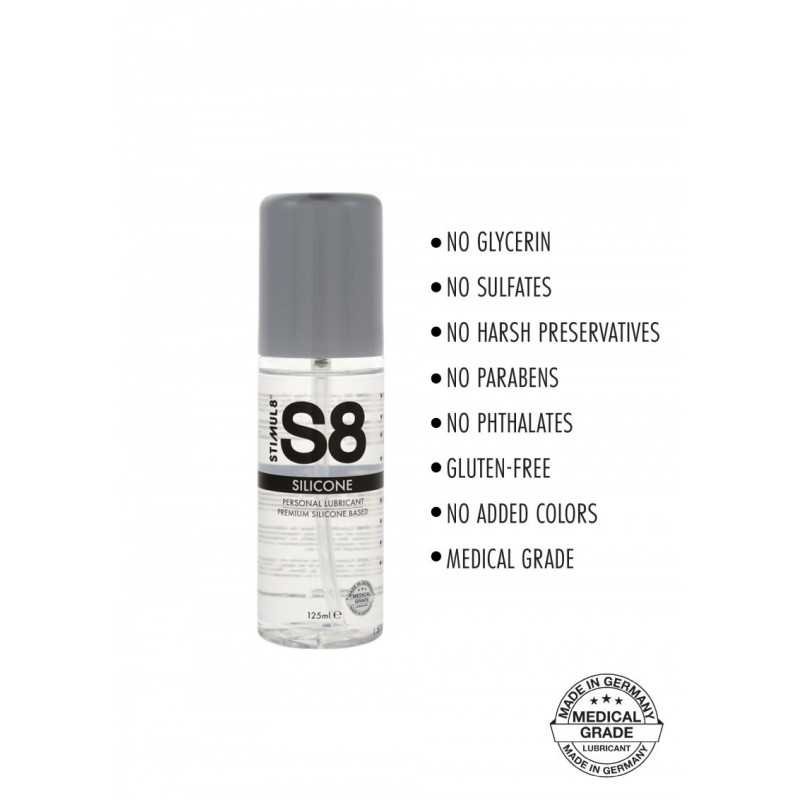 Il lubrificante Premium S8 Premium in silicone offre una scivolata indulgente e duratura con un effetto setoso. L'esclusiva formula a base di silicone è sviluppata per garantire il tocco più morbido, pur essendo delicata sulla pelle e sulle membrane intime. Questo lubrificante di qualità è privo di glicerina, privo di solfati, privo di parabeni, privo di ftalati e non contiene conservanti aggressivi o colori aggiunti. Con l'approvazione di livello medico, S8 Silicone Premium Original Lubricant aderisce inoltre a tutti gli attuali regolamenti UE relativi ai prodotti per l'igiene intima e costituisce un'alternativa affidabile, competitiva e trasparente ad altre scelte non approvate sul mercato.