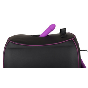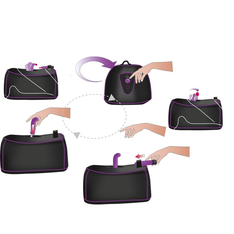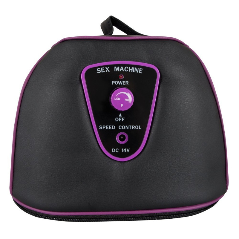 Macchina del sesso nero con due diversi accessori e vibratore montabile per ulteriore stimolazione. Regolazione continua del movimento rotatorio per il massaggio mirato delle zone G e P. Rete legata. Lunghezza 37 cm, larghezza 27 cm, altezza 18 cm. ABS, silicone, PU.