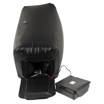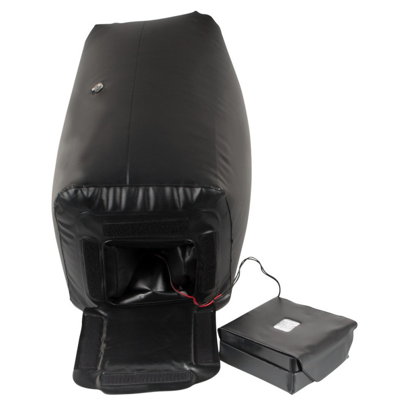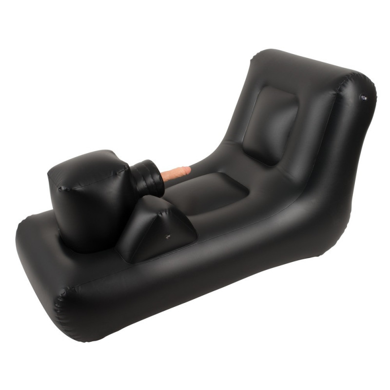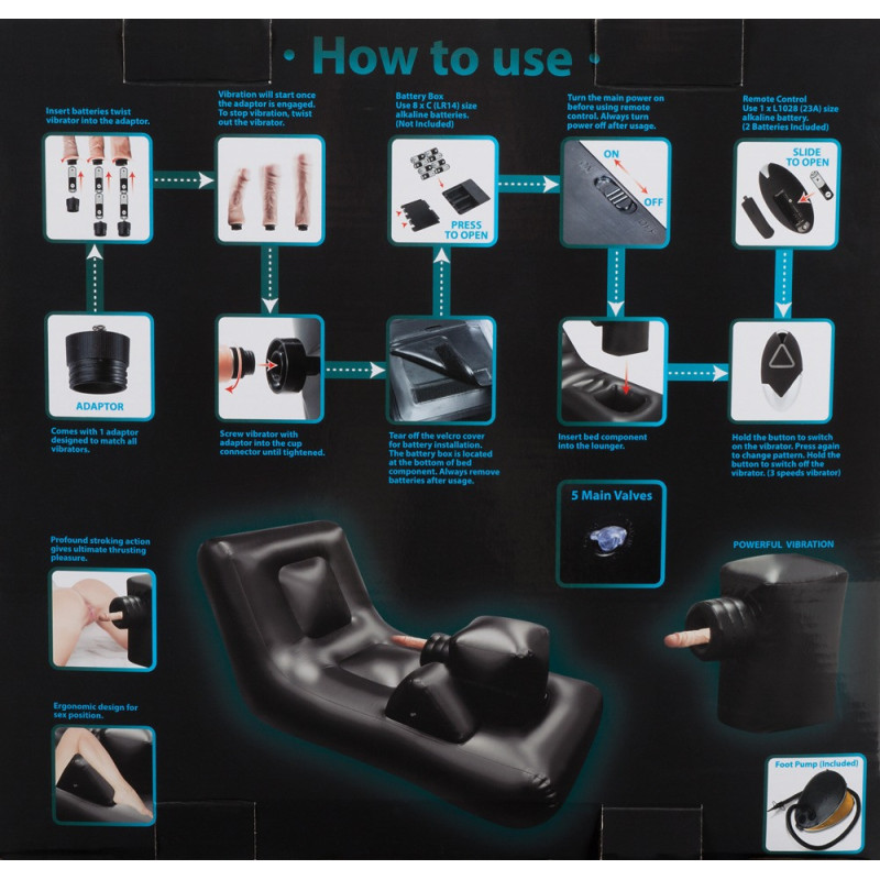 Lettino gonfiabile nero con elemento gonfiabile separato (50 cm di altezza, 30 cm di larghezza, 30 cm di profondità), che ha una funzione d'urto telecomandata a 3 stadi. La fornitura comprende tre vibratori, che possono essere utilizzati anche separatamente e vibrano non appena vengono avvitati nell'adattatore.