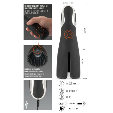Questo potente masturbatore fornisce una stimolazione particolarmente intensa con la sua vibrazione molto dura in 10 modalità. Inoltre, le protuberanze massaggiano all'interno e forniscono l'eccitazione. Il diametro può essere regolato con una leggera pressione. Cavo di ricarica USB incluso.