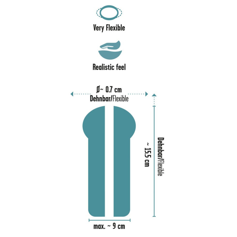 Lunghezza totale 15,5 cm, Ø esterno 7 cm, Ø interno stretto ed elastico. TPE.