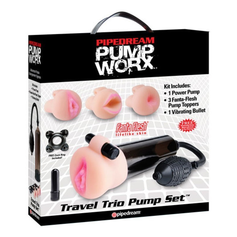 Godetevi tutte le comodità di casa quando siete in viaggio con l'incredibile Travel Trio Pump Set. Questa collezione portatile di topper per pompe trasformerà questa normale pompa per il pene in una combinazione di masturbatore e dispositivo di ingrandimento. Il kit deluxe da 9 pezzi è contenuto in una comoda scatola da viaggio con maniglia e comprende una pompa elettrica per principianti, 3 guaine per il piacere Fanta-Flesh, un bullet vibrante impermeabile, un cockring elastico e campioni gratuiti della nostra lozione per il corpo umida, del detergente per giocattoli Pump Worx e della crema addensante. La morbida e soffice Fanta-Flesh avvolge ogni centimetro della vostra asta del piacere, per un'aderenza che sembra migliore di quella reale. Ad ogni pressione della pompetta di tipo medico, il vostro cazzo diventerà più grosso, più spesso e si gonfierà con potenza. Il tubo sottovuoto trasparente consente di osservare la crescita del vostro cazzo, mentre la valvola a rilascio rapido alleggerisce la pressione premendo un pulsante. Per prolungare l'eiaculazione, fate scorrere l'anello di potenziamento incluso sulla vostra asta fino a quando non sarà ben aderente. Per prolungare l'eiaculazione, fate scorrere l'anello di potenziamento incluso sull'asta fino a renderlo ben aderente. La stretta prolungherà l'eiaculazione, aiuterà a mantenere l'erezione e prolungherà il divertimento. Quando avete finito, staccate semplicemente il cilindro dal tubo di aspirazione, togliete il topper della pompa e riportatelo come nuovo con il detergente per giocattoli Pump Worx e acqua calda.
