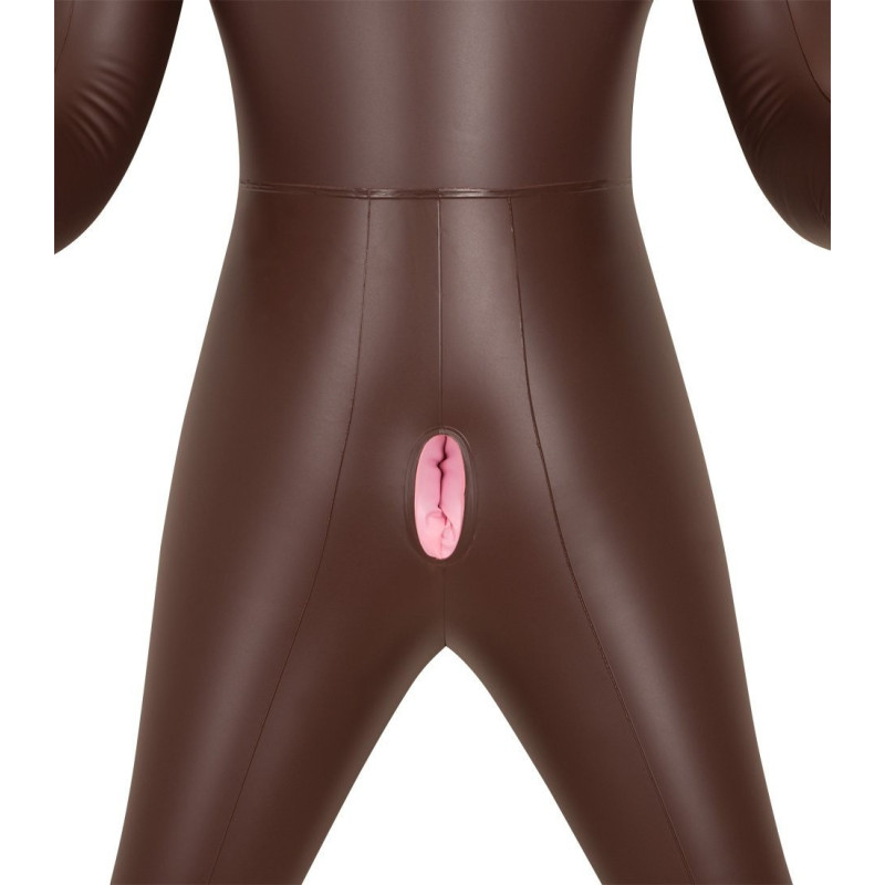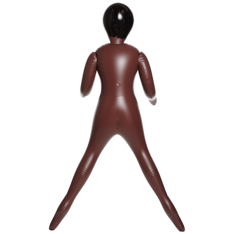 Bambola gonfiabile colore carne scura a grandezza naturale con una pelle di velluto marrone, una bocca disposta, la vagina e l'ano stretto opening.