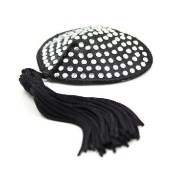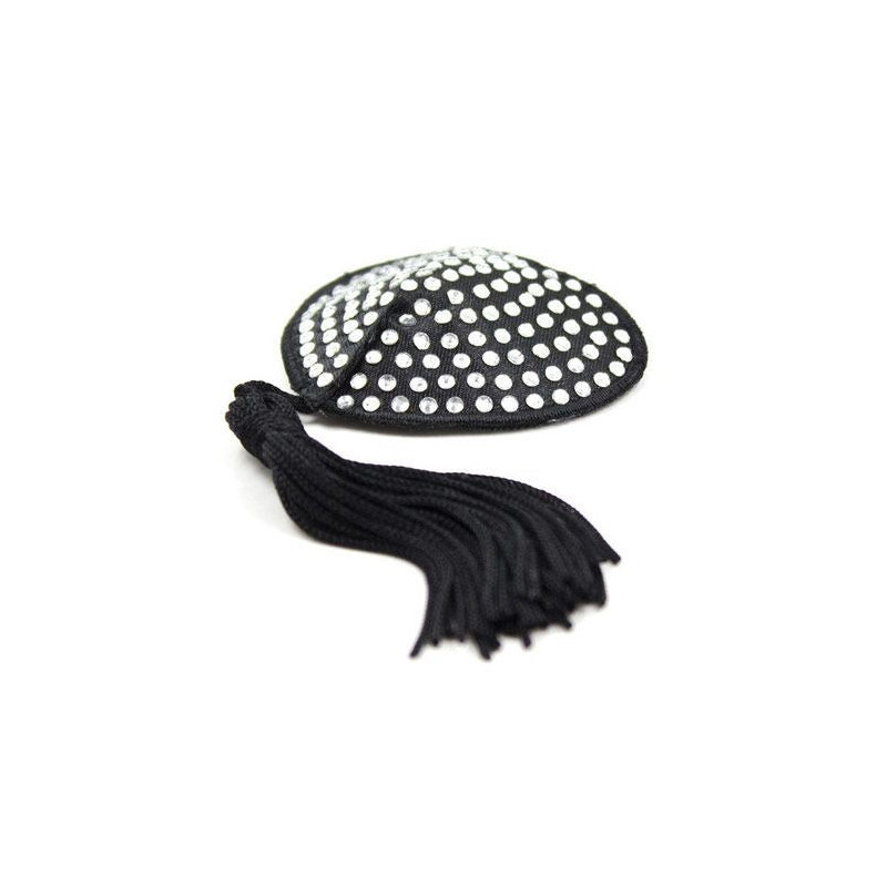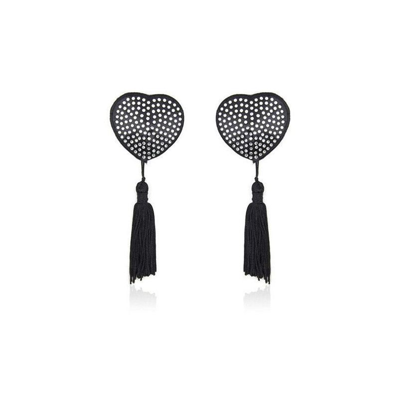 Copricapezzoli a forma di cuore con strass argentati e nastrini neri. Un prodotto della linea Fetish Art di Toys4Lovers.