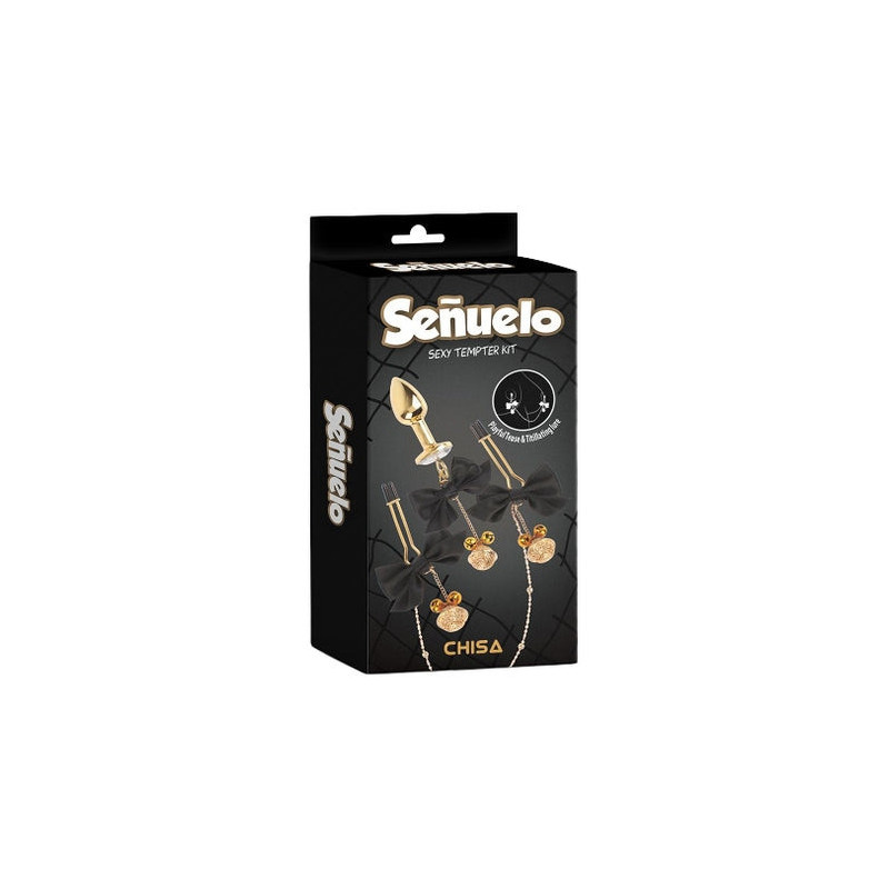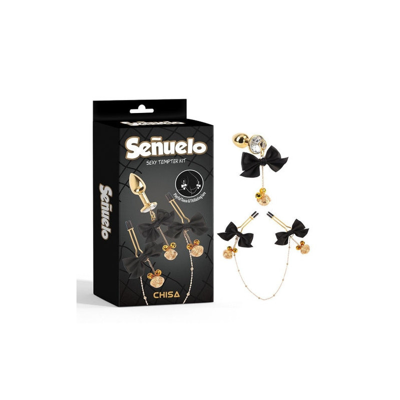 Il Chisa Sexy Temper Kit è set di accessori erotici progettati per amplificare il piacere e l'eccitazione durante i giochi erotici. Questo set offre una combinazione unica tra stimolazione dei capezzoli e anale, permettendo agli utenti di esplorare una varietà di sensazioni e di raggiungere nuovi livelli di soddisfazione. Il set contiene due morsetti per capezzoli regolabili e un plug anale, tutti decorati con graziosi fiocchi e catenelle con campanellini.