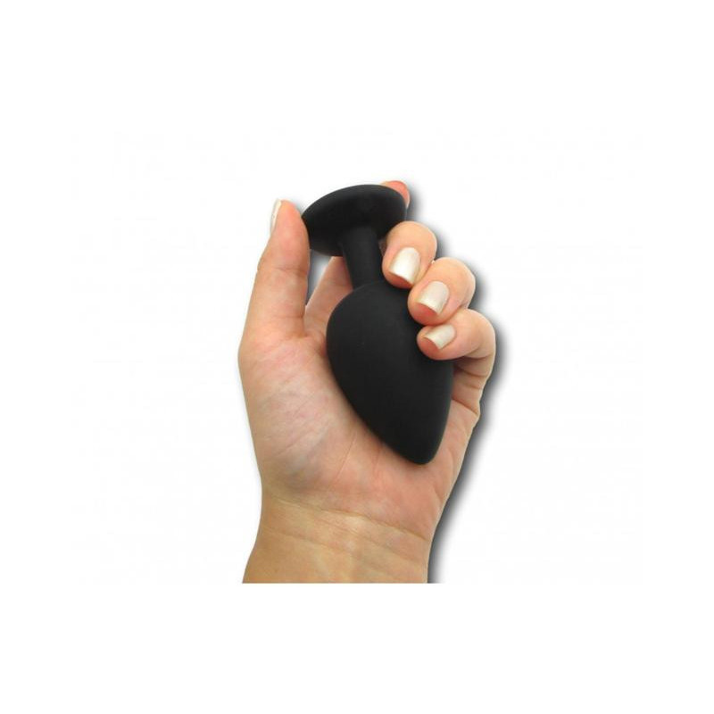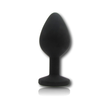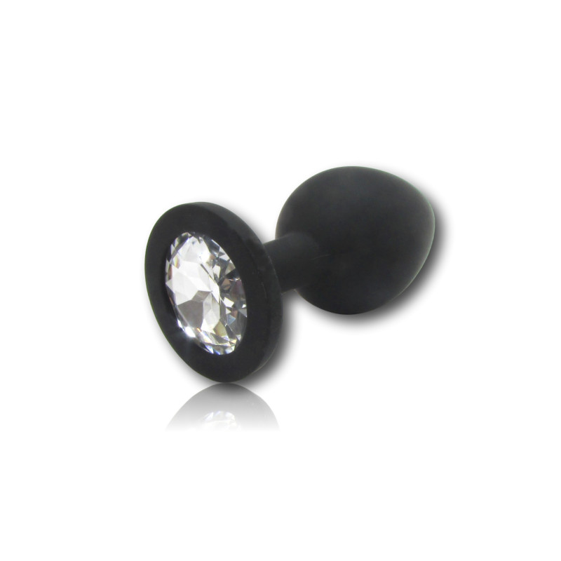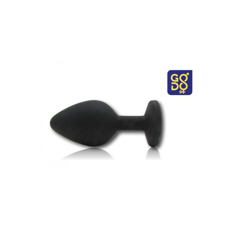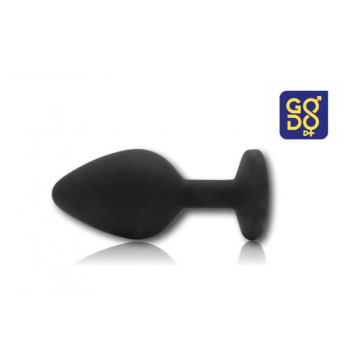 Questo plug grande in silicone, prodotto da Godo di più, presenta una superficie liscia con un gioiello trasparente incastonato alla base.