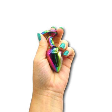 Questo plug grande in metallo colorato, prodotto da Godo di più, presenta una superficie liscia e colorata con un gioiello arcobaleno incastonato alla base.