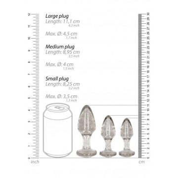 Questo scintillante set di plug è pronto per darti tanto piacere. Inizia in piccolo e fatti strada fino alle dimensioni più grandi. I plug hanno una punta affusolata per un facile inserimento e ulteriore soddisfazione. La base è svasata per il massimo comfort e sicurezza. Basta un po' di lubrificante e sie pronto.