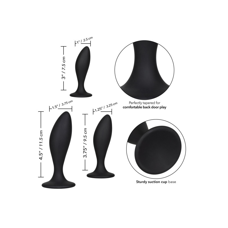 Apritevi a un mondo di eccitante piacere anale con il kit anale Curve in silicone. Concedetevi un piacere da far tremare le ginocchia con il set di 3 misure graduate di plug anali delicatamente curvi con base a ventosa. Aumentate delicatamente il vostro piacere con il design naturalmente curvo che colpisce tutti i punti giusti e mantiene il comfort durante il gioco. Ogni sonda del nostro kit aumenta gradualmente in lunghezza e circonferenza per un piacere superbo a qualsiasi livello di gioco. Mentre ogni aumento del vostro allenamento espande i vostri orizzonti, utilizzate la comoda base a ventosa per una stimolazione vaporosa, un inserimento senza sforzo e una rimozione delicata. Le sonde flessibili sono realizzate in silicone liscio e senza cuciture. Questo materiale sicuro per il corpo non è profumato e non contiene ftalati, per mantenere i vostri punti più sensibili felici e sani.
