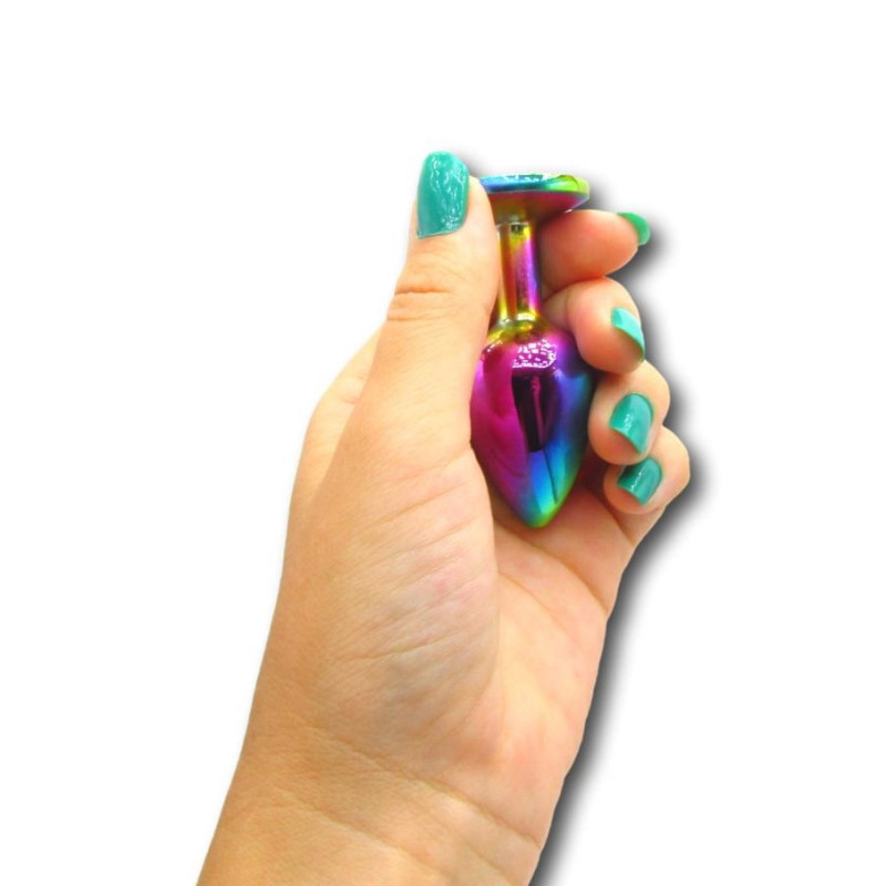 Questo plug piccolo in metallo colorato, prodotto da Godo di più, presenta una superficie liscia e colorata con un gioiello arcobaleno incastonato alla base.