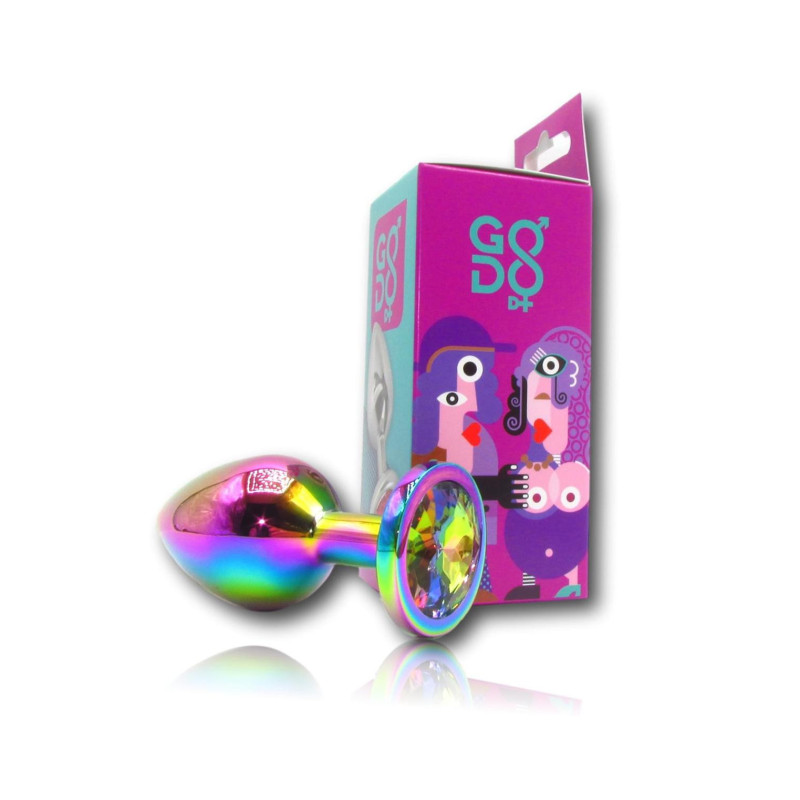 Questo plug medio in metallo colorato, prodotto da Godo di più, presenta una superficie liscia e colorata con un gioiello arcobaleno incastonato alla base.