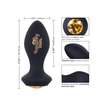 Scuoti e scuoti con le vibrazioni ritmiche del Naughty Bits™ Shake Your Ass™ Petite Vibrating Butt Plug. Questa audace sonda ha un design sagomato e un potente motore vibrante destinato a flettersi con i tuoi movimenti mentre offre una stimolazione che scuote le ginocchia con il tocco del pulsante della pietra preziosa. Concedetevi un piacere personalizzato mentre l'elegante sonda pulsa con 10 vibrazioni vivaci, pulsazioni appassionate ed escalation erotiche. Per garantire tutto ciò che l'esaltante mondo del gioco anale ha da offrire, abbiamo creato una sonda delicatamente affusolata per il massimo del comfort e della stimolazione. La forma flessibile e la base flangiata permettono un facile inserimento e rimozione, mentre l'intenso motore ti fa rabbrividire di piacere. Se stai facendo un tuffo con un amante o indulgendo in una sessione di vapore da solo, guarda avanti fino a 2 ore di vibrazione impermeabile a bassa velocità e 1,5 ore ad alta velocità. Ricarica il piacere e torna a giocare in sole 2 ore con il cavo USB fornito.La collezione Naughty Bits™ è fatta per distinguersi in qualsiasi comodino con design accattivanti e caratteristiche orgasmiche. Il silicone ultra felpato e l'abbagliante pulsante in pietra preziosa di questa splendida sonda anale faranno sorridere anche l'amante più elegante prima e dopo.