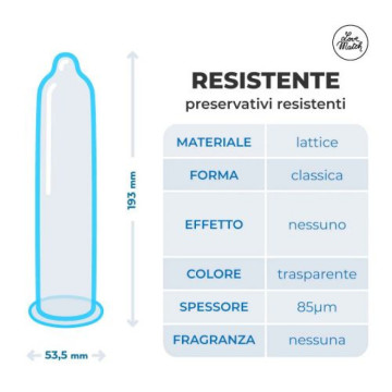 Super resistenti, super lubrificati e super sicuri con uno spessore maggiore rispetto a quello dei classici profilattici. I Love Match Resistente sono preservativi in lattice dalla forma classica con serbatoio, estremamente resistenti, confortevoli e particolarmente indicati per rapporti prolungati o per il sesso anale! Grazie al loro maggior spessore, infatti, sono più resistenti agli stress da strappo e donano la massima sicurezza e protezione. Se utilizzati correttamente, tutelano la donna da gravidanze indesiderate e proteggono entrambi i partner da malattie sessualmente trasmissibili. Sono realizzati in lattice di gomma naturale, hanno una larghezza nominale di 53,5 mm e sono dotati di un'apertura no-stress