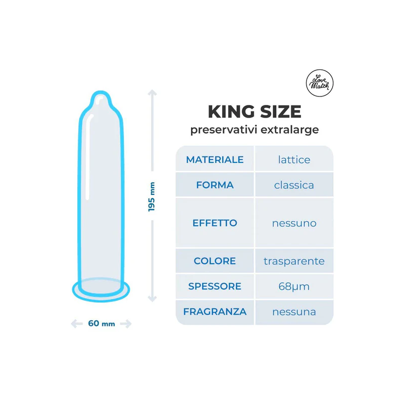 I preservativi King Size Love Match in lattice dalla forma classica con serbatoio sono caratterizzati da una larghezza nominale maggiore rispetto agli altri preservativi. Sono stati progettati per fornire sostegno a coloro che hanno un pene di taglia XXL, con una circonferenza tra i 12 e i 13 cm. Queste misure, infatti, assicurano una comoda vestibilità e una perfetta aderenza sul pene in erezione. Realizzati in lattice di gomma naturale; Hanno una larghezza nominale di 60 mm. Dotati di un'apertura no-stress. É necessario lavarsi sempre accuratamente le mani prima di scartare il condom. Fai attenzione a non lacerarne la superficie durante l'inserimento. Conservare in luogo fresco e asciutto, lontano dalla luce diretta del sole.