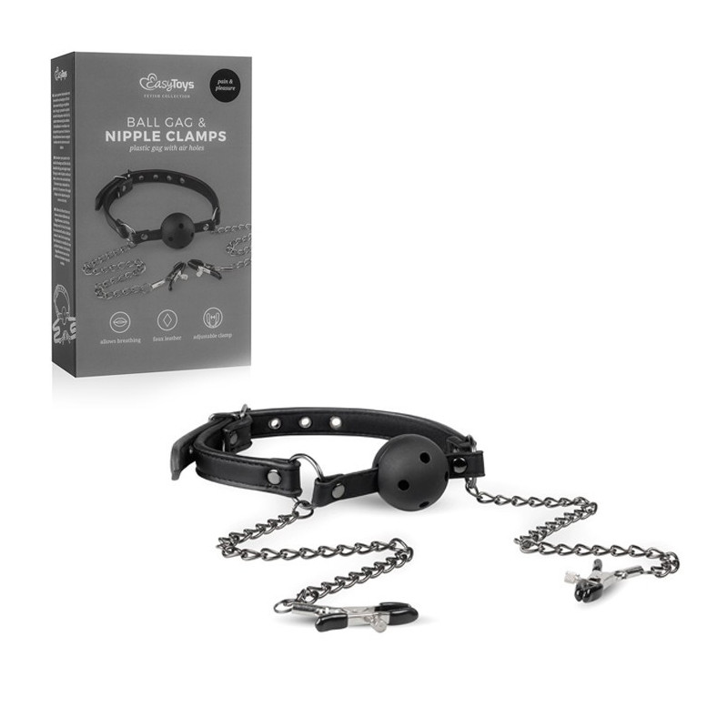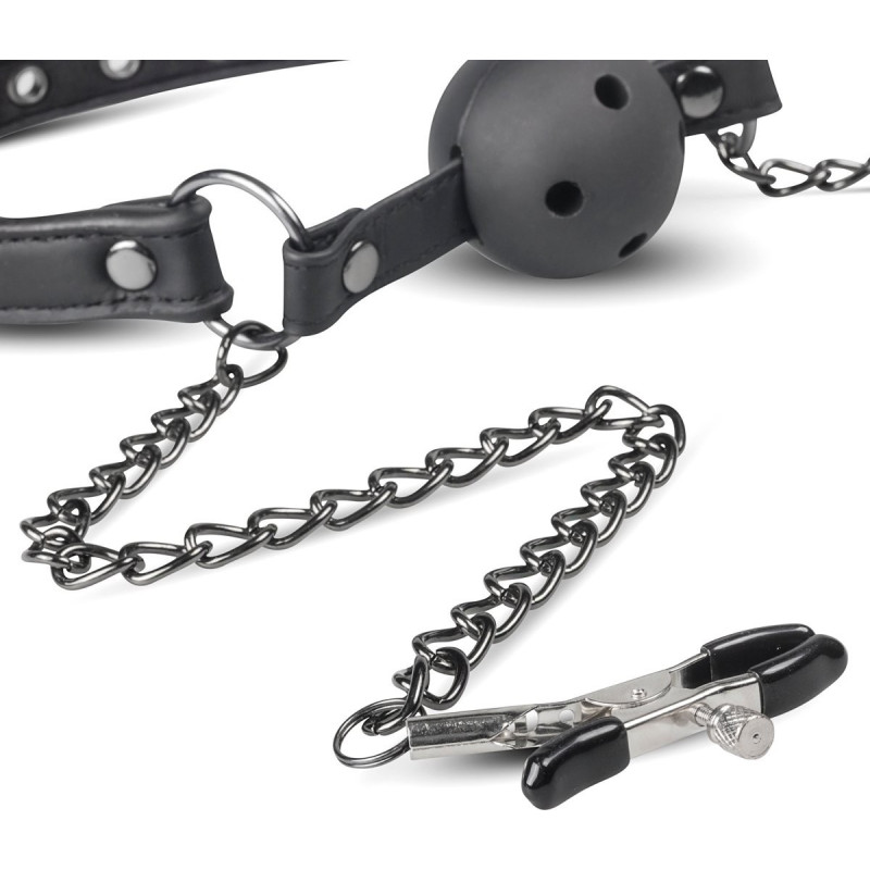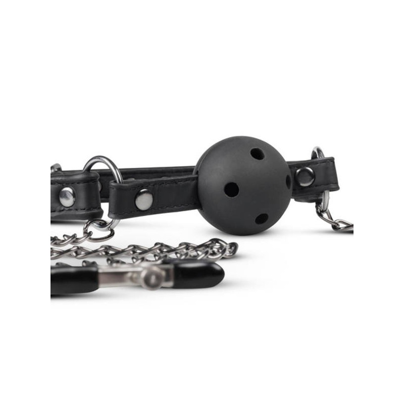 Morso gag ball con pinze per capezzoli. Le mollette stringi capezzoli sono regolabili per poter gestire la pressione che devono avere. La palla del morso traspirante e dotata di fori per poter respirare durante l'utilizzo . La cinghia è regolabile e si adatta a tutte le misure.