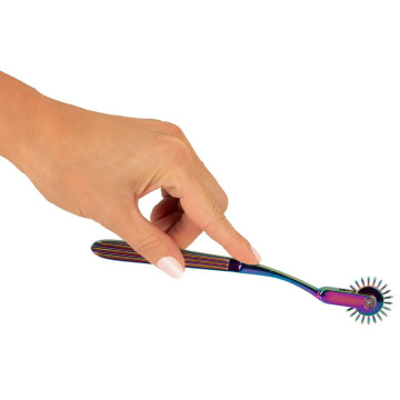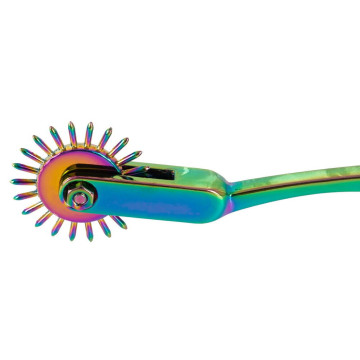 Colpisce il nervo scoperto del sesso! Robusta girandola metallica Rainbow Single Pinwheel della collezione fetish in scintillanti colori arcobaleno. Viene fatta rotolare sulla pelle con maggiore o minore pressione, provocando sensazioni delicatamente stimolanti o un intenso e piacevole dolore. La ruota è costellata di piccoli aghi molto affilati e può essere utilizzata in qualsiasi punto del corpo. L'impugnatura lunga e stretta si adatta comodamente alla mano e garantisce una guida ottimale e una pressione variabile e facile da applicare.