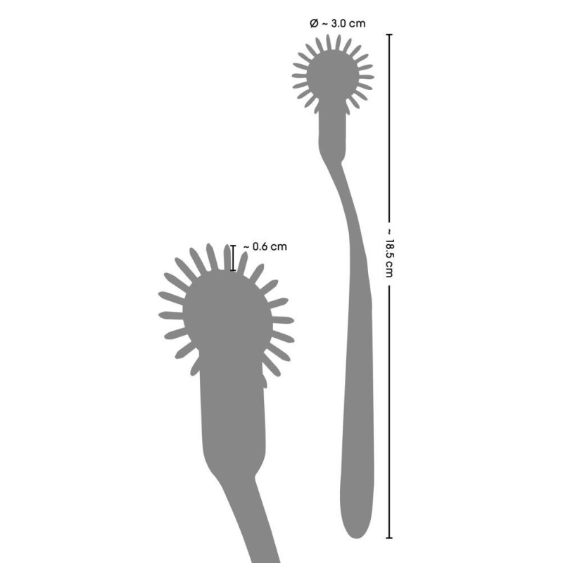 Lunghezza totale 18,5 cm, ruota Ø 3 cm, punte degli aghi lunghe 6 mm. Peso 57 g. Metallo.