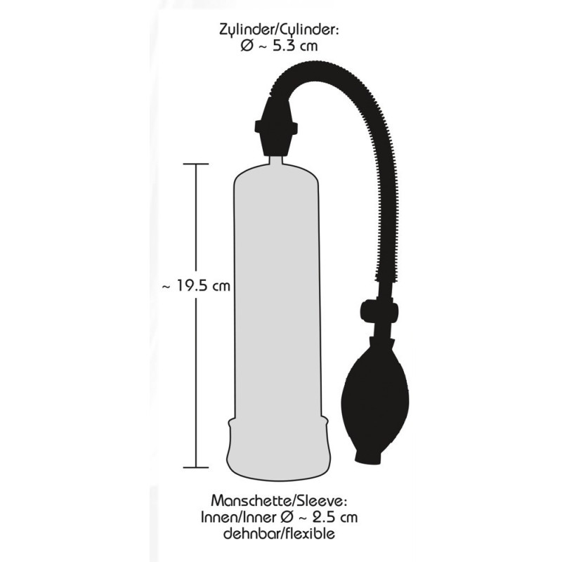 Portate LUI in condizioni ottimali! Pompa a vuoto che consente di allenare efficacemente il pene e la potenza con risultati permanenti. Pratica sfera di pompaggio con valvola di sicurezza a pressione. Cilindro a vuoto trasparente lungo 20,2 cm, profondità di inserimento 19,5 cm, Ø interno 5,3 cm, Ø esterno 5,5-5,8 cm. Ø dell'apertura del manicotto 2,5 cm (flessibile). ABS, PVC, TPE, SAN.