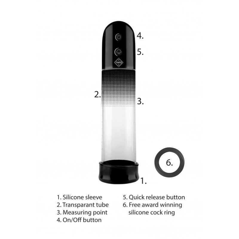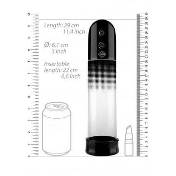 Con cilindro lungo 20 cm (7.8") e un diametro di 6 cm (2.36"), questa pompa di alta qualità vi regala tantissime possibilità di far crescere le vostre dimensioni in lunghezza e larghezza! La guaina è realizzata in silicone liscio. Sorprendetevi ogni volta delle dimensioni che potete raggiungere! Toccando un tasto questa pompa restremamente potente creerà un'aspirazione fortissima, garantendo un'erezione veloce e potente. L'apertura in morbido silicone creerà una tenuta stretta ma confortevole. Funziona con 2 batterie AA. ATTENZIONE: Leggere il manuale del prodotto prima di utilizzare qualsiasi tipo di pompa pene o anello di costrizione. Interrompere immediatamente l'utilizzo dei dispositivi se si avverte dolore o fastidio.