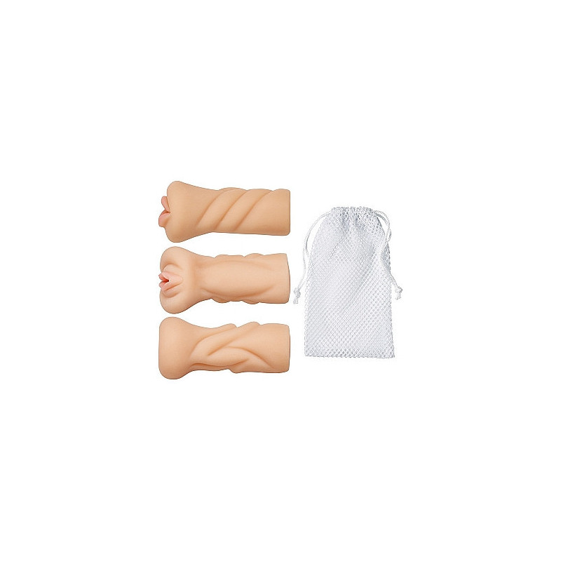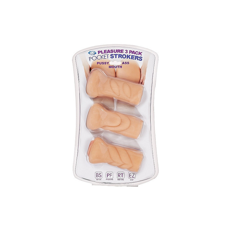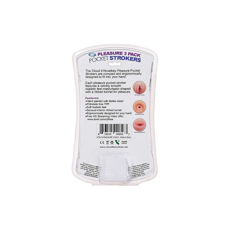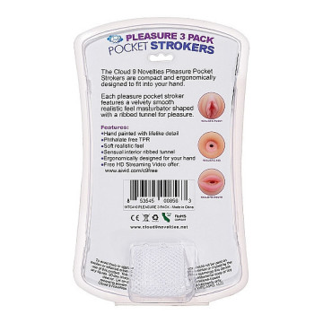 Il Cloud 9 Personal Pocket Pussy Stroker, Anal, e Mouth Stroker Kit include (3) stroker compatti ed ergonomici che si adattano alla tua mano. Ogni tasca da tasca del piacere in questo set è vellutato, realistico e presenta tunnel a coste per il tuo piacere.