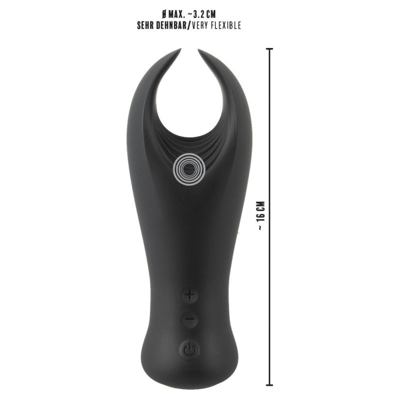 Lunghezza totale 16 cm, ali lunghe 4 cm, Ø interno 3,2 cm (molto elastico). Peso 251 g. Silicone, PU, ABS.