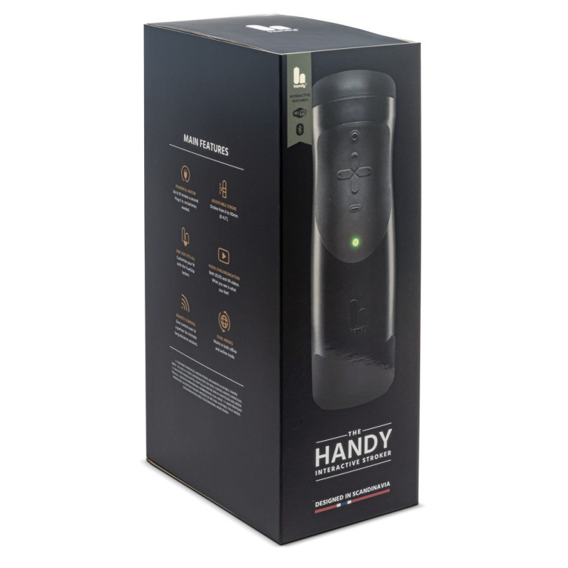 Il masturbatore high-tech The Handy Interactive Stroker ha ricevuto un aggiornamento del software (firmware 3) e ora funziona in modo ancora più potente e stabile. Anche l'hardware è stato migliorato e la guaina è ora ancora più scivolosa. La confezione è stata rinnovata con stile e la guida rapida (in inglese, tedesco, francese e spagnolo) è ora inclusa nell' The Handy Interactive Stroker, in modo che possiate iniziare a usarlo subito. Pratico anche il nuovo adattatore angolare a 90° per l'alimentatore.