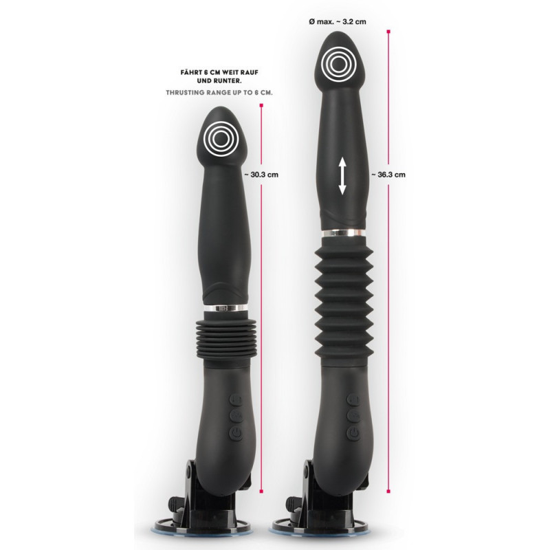 Questo vibratore convince con le sue spinte profonde fino a 6 cm in 3 velocità regolabili. Non solo la velocità e la profondità stimolano, ma anche le 7 modalità di vibrazione possono essere controllate separatamente, rendendo questo vibratore un tuttofare. La superficie morbida e la forma stimolante scivolano come per magia e assicurano una penetrazione intensa. La base di aspirazione rimovibile e regolabile, insieme al telecomando, consente di utilizzare il vibratore a mani libere o di passare il controllo al partner. Il telecomando incluso, proprio come il vibratore stesso, è ricaricabile con il cavo di ricarica USB incluso. Inoltre, la chiusura a bottone garantisce un viaggio discreto.