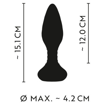 Lunghezza totale 15,1 cm, lunghezza d'inserimento 12 cm; Ø max. 4,2 cm, cono Ø 2 cm. Peso 199 g. Silicone, PU, ABS.