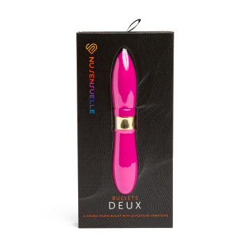 I Deux bulletS sono a doppia estremità, il che li rende multiuso. Ogni estremità del bullet sfoggia una forma distinta e contiene il proprio motore 60SX, che comanda 12 velocità di vibrazione. L'estremità appuntita del bullet è ottimale per la stimolazione puntuale, mentre la sua estremità più arrotondata fornisce una copertura massimizzata. Le possibilità sono infinite!