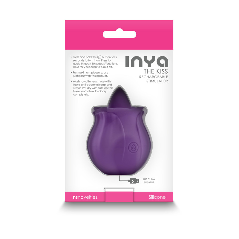 Bacio INYA. Splendidamente realizzato con un sorprendente design a bocciolo di rosa, il Kiss stimola il clitoride con rapide vibrazioni della lingua per un climax intenso. Realizzato in morbido silicone, è ricaricabile e adatto ai viaggi.