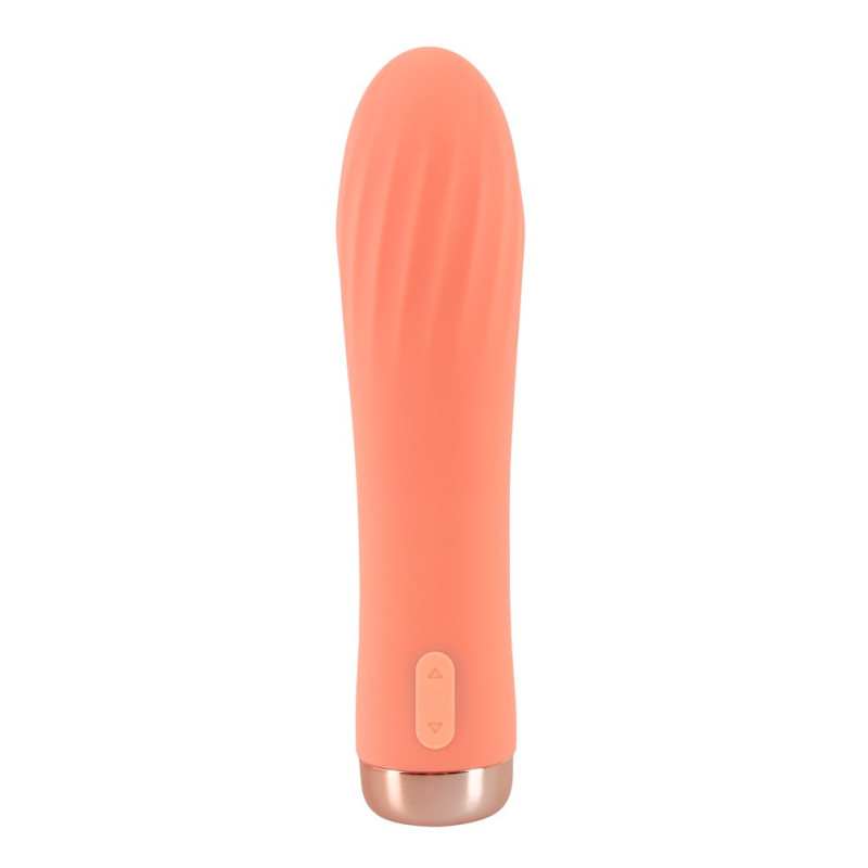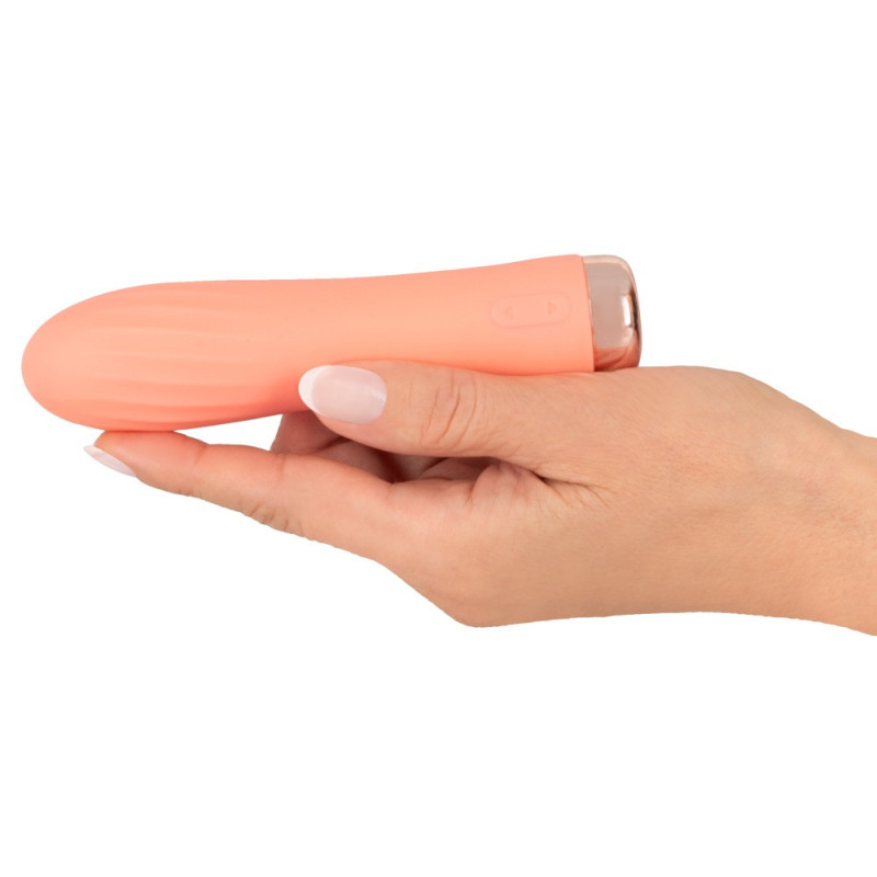Mini vibratore scanalato pastello da Peachy! in stimolante design a scanalature con testa paffuta - entra in ogni tasca! 10 modalità di vibrazione assicurano un divertimento vario con variazioni di gioco vaginale e anale, così come la stimolazione di punti di piacere esterni e può essere comodamente controllato su e giù con il tocco di un pulsante. Il materiale in silicone di alta qualità con una consistenza morbida al tatto fornisce una sensazione di pelle molto piacevole durante il gioco e le coccole. Ricaricabile - cavo di ricarica USB incluso.