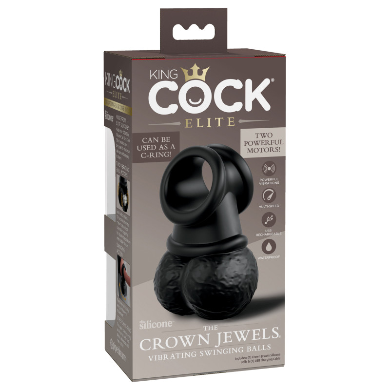 Preparati per i gioielli della corona! Queste palline oscillanti vibranti di King Cock Elite sono dotate di silicone Elite morbido come la seta all'esterno, palline vibranti solide all'interno e un anello a C super elastico che funziona alla grande con la maggior parte dei dildo, vibratori e persino cazzi! Le due sfere vibranti offrono 10 modalità di vibrazione potente e trasformano qualsiasi dildo in un'atmosfera da coniglio. Le palline vibranti possono essere azionate dal telecomando wireless King Cock Elite (non incluso in questa confezione). Usando i gioielli della corona oscillanti come un anello a C, aggiunge un nuovo livello di divertimento vibrante e schiaffeggiando alla tua vita amorosa. Queste palline vibranti sono un must per ogni collezione reale!