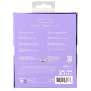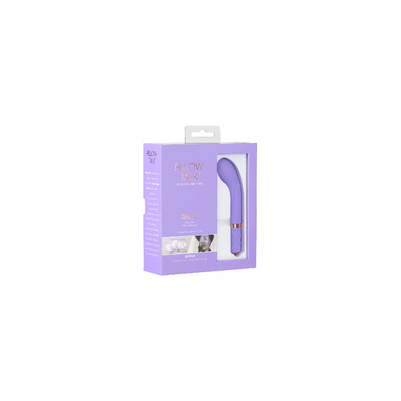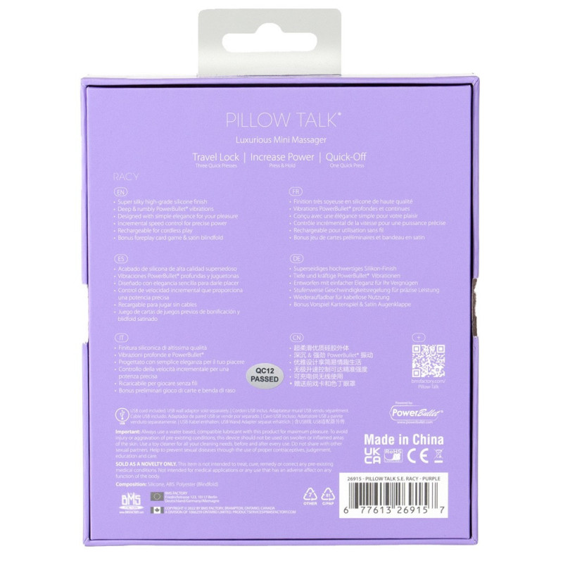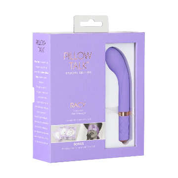 L'edizione speciale Racy di Pillow Talk vi invita a parlare a letto. Il popolare mini vibratore del punto G Racy è affiancato da un eccitante gioco di carte per coppie con ispirazione per i preliminari e una sciarpa di raso di alta qualità come benda o per momenti accattivanti.