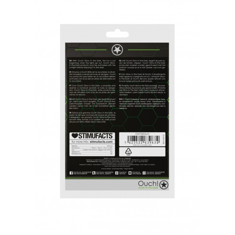 Glow-In-The-Dark di Ouch!, il futuro del bondage è qui. Progettato con un'estetica bondage autentica, ma con il piacere aggiunto delle proprietà luminescenti al buio, i dettagli in verde fluorescente trasformeranno ogni evento in qualcosa di unico. Sei pronto per un piacere estremo? Allora devi provare questo anello fallico con cinturino per testicoli! Conferirà al tuo pene la grande forza desiderata mentre fornisce una presa salda attorno allo scroto. Aiuterà anche a prevenire l'eiaculazione precoce. I prodotti Glow-In-The-Dark di Ouch! devono essere attivati con la luce solare prima di usarli al buio.
