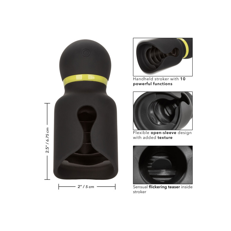 Il Boundless Flickering Stroker è un masturbatore pulsante realizzato per la massima eccitazione della testa con un'esclusiva lingua tremolante. L'accarezzatore portatile in silicone offre un controllo totale del piacere con 10 funzioni di vibrazione, superficie testurizzata e stuzzicatore tremolante. Il controllo totale del piacere con l'accarezzatore portatile, la cui superficie testurizzata unica stimola ulteriormente il piacere. Le funzioni di vibrazione aumentano il piacere, mentre la superficie testurizzata stuzzica sensualmente. Il teaser tremolante offre un'estrema eccitazione della testa. Con la semplice pressione di un pulsante è possibile scegliere tra 10 potenti funzioni di vibrazione e azione tremolante. Godetevi fino a 50 minuti di piacere vibrante. Ricaricate la vostra passione in 1,5 ore collegando il cavo USB in dotazione alla porta di ricarica autosigillante sul manico dello stroker.