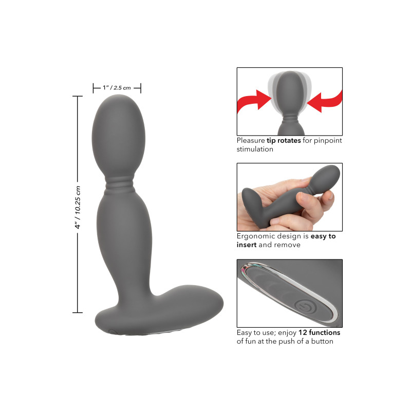 Informazioni aggiuntive : Sonda anale ricaricabile in silicone premium con punta rotante, 12 intense funzioni di vibrazione, pulsazione ed escalation, La punta del piacere ruota per una stimolazione mirata, Il chip di memoria all'avanguardia riprende dall'ultima funzione utilizzata, Funzione di sicurezza per il blocco del viaggio: tenere premuto per 3 secondi per accendere o spegnere il dispositivo, Ricaricabile via USB - cavo di ricarica incluso, Carica completa in 1 ora, Funziona per 40 minuti ad alta velocità e 60 minuti a bassa velocità.
