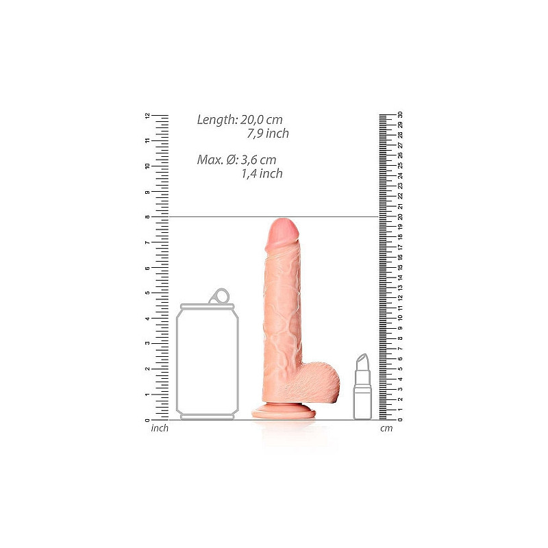 Il Real Rock è progettato per farti divertire al massimo. Un dildo solido e morbido al tatto, dall'aspetto naturale e delle dimensioni giuste. In combinazione con le vene realistiche sull'asta, che danno una stimolazione extra all'interno, questo è un dildo che non dimenticherai nel tuo comodino. Questo dildo realistico ha una leggera curva, che lo rende ideale per la stimolazione del punto G. Goditi questo modello dentro e fuori! Lo scroto e il glande ben proporzionato sono i dettagli che rendono l'utilizzo di questo dildo così realistico. La ventosa consente un uso resistente a mani libere (su una superficie liscia) e offre anche la possibilità di utilizzare questo RealRock in un'imbracatura. Con tutte queste opzioni, avrai un orgasmo esplosivo a cui non mancherà nulla.